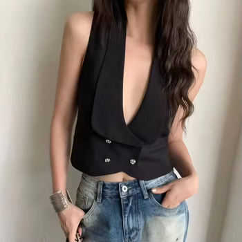 Высококачественный бутик облегающий черный жилет Топ для женщин индивидуальный дизайн Бесплатная доставка двубортный однотонный без рукавов Глубокий V